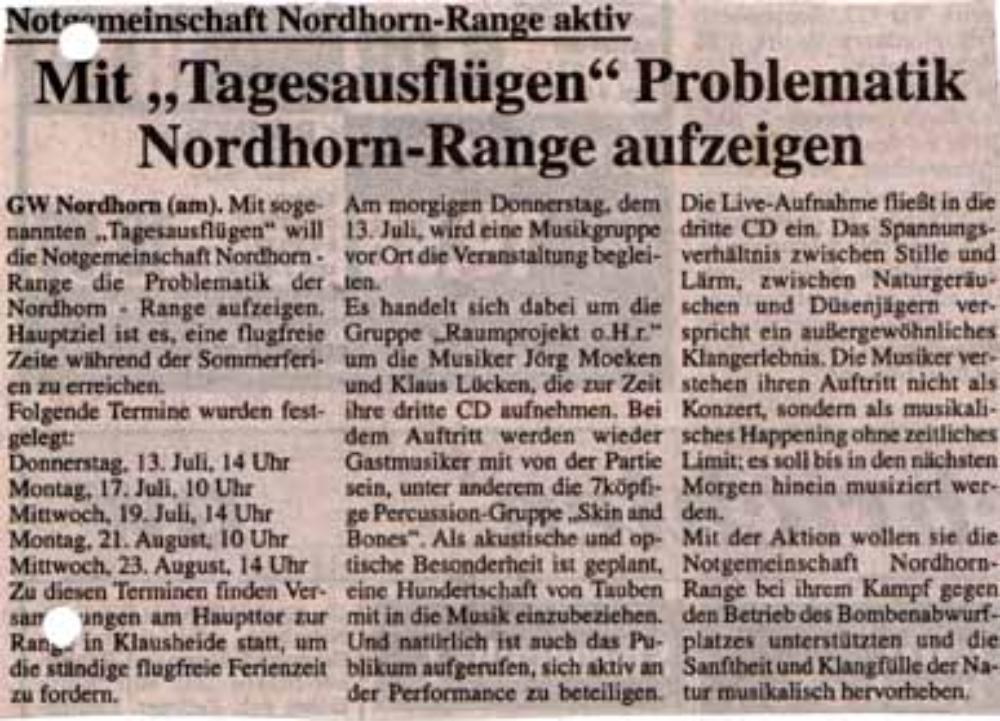 Raumprojekt.o.H.r. - Nordhorn Range 2000beteiligte Musiker: v. l. n. r.:Klaus Lücken - afrikanische Percussion und akk. Gitarre, Jörg Moeken - Keyboards, Elgo Lammering - E-Gitarren, Axel Schüüring Schlagzeug, Jan Wirts - nicht abbgebildet - Schlagzeug, Sebastian Siebrecht - nicht abgebildet - Bass, Annika Pasternak Keyboards u. Mitgestaltung Natur-Aufnahmen Soundtracks, F. Steinecke - CelloEinige Musiker der Trommelgruppe Skin & Bones(c) Raumprojekt.o.H.r.2000